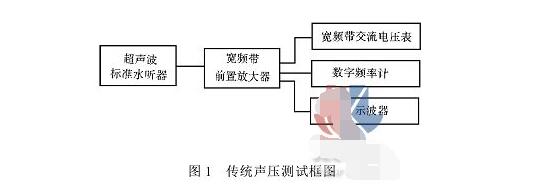 盡管存在著種種困難,但生產(chǎn)實踐特別是科學研究中又迫切需要測量超聲波清洗機超聲波聲壓及聲場狀況。在研究領域,一般用多臺儀表組合的方法實施對聲場的測量,它的測試框圖如圖1所示:
